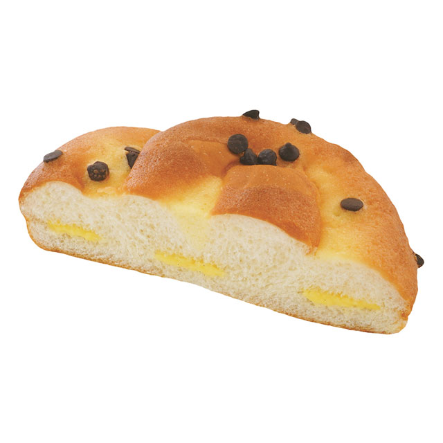 | 新製品の特長 | ふんわりとした生地にケーキ生地を絞り、チョコチップをトッピングして焼き上げ、カスタードクリームをサンドしました。 |