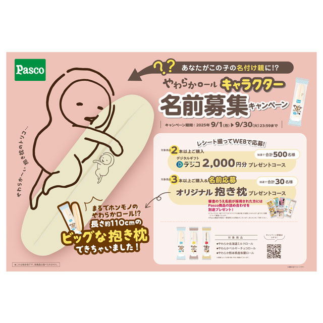 新製品の特徴 | 敷島製パン株式会社(Pasco)は、「やわらか熊本県産和栗ロール」を2025年9月1日(月)より、関東・中部・関西・中国・九州地区にて発売します。 2024年1月に発売した「やわらかロール」シリーズは、発売1年7カ月(2025年7月末時点)で出荷数がシリーズ累計4,100万本を突破した人気商品です。ふんわりやわらかいパン生地と、なめらかなクリームで多くのお客さまにご愛顧いただいています。 今回発売する「やわらか熊本県産和栗ロール」は、ふんわりやわらかい白生地に、栗の産地として知られている熊本県産和栗のクリームをはさみました。 ▼好評発売中 やわらか北海道ミルクロール やわらかベルギーチョコロール 『あなたがこの子の名付け親に!?やわらかロール キャラクター名前募集キャンペーン』実施 2025年9月1日(月)~ 9月30日(火)の1カ月間にわたり、「やわらかロール」シリーズ3アイテムを対象とした『あなたがこの子の名付け親に!?やわらかロール キャラクター名前募集キャンペーン』を実施します。 対象商品を購入してレシート画像を登録、デジタルギフト「デジコ」か「オリジナル抱き枕」のどちらかを選んで応募いただくキャンペーンです。抽選で、総計530名様に当たります。 ■キャンペーン名 『あなたがこの子の名付け親に!?やわらかロール キャラクター名前募集キャンペーン』 ■応募期間 2025年9月1日(月)0:00 ~ 9月30日(火)23:59 ※2025年9月1日(月)~ 9月30日(火)購入のレシートが対象です。 ■賞品・当選者数と応募条件 【Aコース】デジタルギフト「デジコ」 2,000円分プレゼントコース 500名様 …対象商品を2本以上ご購入いただきご応募ください。 【Bコース】オリジナル抱き枕 30名様 …対象商品を3本以上ご購入&キャラクター名をあわせてご応募ください。 また、ご応募いただいた名前が採用された「名付け親」さまには、Pasco商品の詰め合わせをプレゼントいたします。(*) (*)「キャラクター名アイデア」は「オリジナル抱き枕」の当落にかかわらず、全てのご応募について審査いたします。 総計530名様 ■対象商品 やわらか北海道ミルクロール やわらかベルギーチョコロール やわらか熊本県産和栗ロール ■応募方法 対象商品を2本または3本(組み合わせは問いません)購入いただき、パッケージに記載の二次元コードを読み取って応募サイトにアクセス。ガイドに従い、購入レシート画像を添付&アンケートに回答してご応募ください。 応募サイトへはこちらからもアクセスいただけます。 https://pasco-y-roll-name-cp.jp (2025年8月20日(水)14:00オープン) ■当選発表 厳正なる抽選のうえ当選者を決定し、デジタルギフト「デジコ」はご応募時に登録いただいたメールアドレスへの賞品配信をもって、「オリジナル抱き枕」は発送をもって、発表にかえさせていただきます。また、「名付け親さまへのPasco商品の詰め合わせ」につきましては、厳正なる審査のうえ名付け親さまを決定し、商品の発送をもって発表にかえさせていただきます。 ※デジタルギフト「デジコ」と「オリジナル抱き枕」は2025年10月下旬発送予定。「名付け親さまへのPasco商品の詰め合わせ」は2026年3月上旬頃発送予定です。 ■キャンペーンに関するお問合せ先 「あなたがこの子の名付け親に!?やわらかロールキャラクター名前募集キャンペーン」事務局 TEL: 03-3496-3183 受付:10:00~17:00 土日祝を除く、2025年9月1日(月)から10月31日(金)まで ■お客さまからのお問合せ先 お客さま相談室(フリーダイヤル)TEL:0120-084-835 【受付時間】9:00~17:00(夏季休暇・年末年始・一部祝日を除く月~金) |