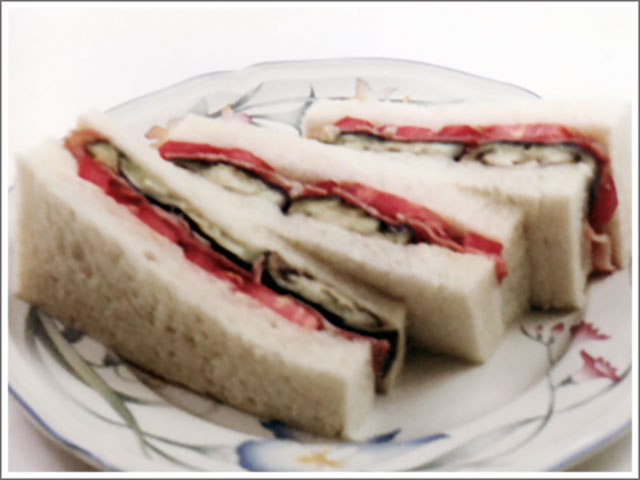 「秋なすは嫁に食わすな」と言われる位おいしいなすを使ってみました。なすと油との相性のよさを活かしたサンドイッチです。塩味としてパンチャッタ(熟成生ベーコン)を使い、ソースの代りとして昔ながらの酸味のあるトマトをサンドしました。