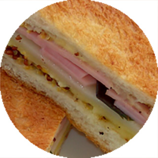 | ハム/スライスチーズ/粒マスタード/マヨネーズ/バジル/胡椒/食パン/しゃぶしゃぶ用餅 |