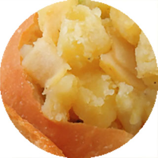 じゃが芋を玉ねぎと一緒にコンソメで煮て、バター味に仕上げたものとりんごとのサンドイッチ。いつものマヨネーズ味ポテトサラダとは違ったポテトを味わってください。