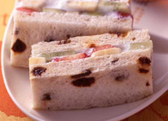 甘みのあるぶどうパンに、くだものとヨーグルトのほどよい酸味がよく合います。くだものからビタミンCが、ヨーグルトからカルシウムが、ぶどうパンからは食物繊維がとれます。